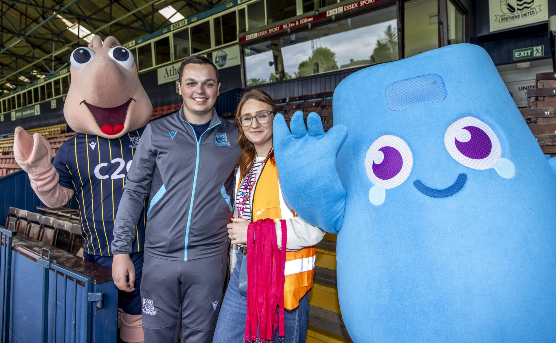 Fifth Image ‘The trophy presentation team of Sammy the Shrimp, Rylee Doe (Commercial Manager, Southend United), Alice Shimali (Head of Communications, c2c) and Pip!’